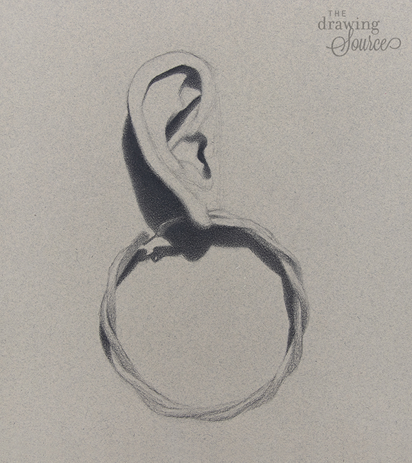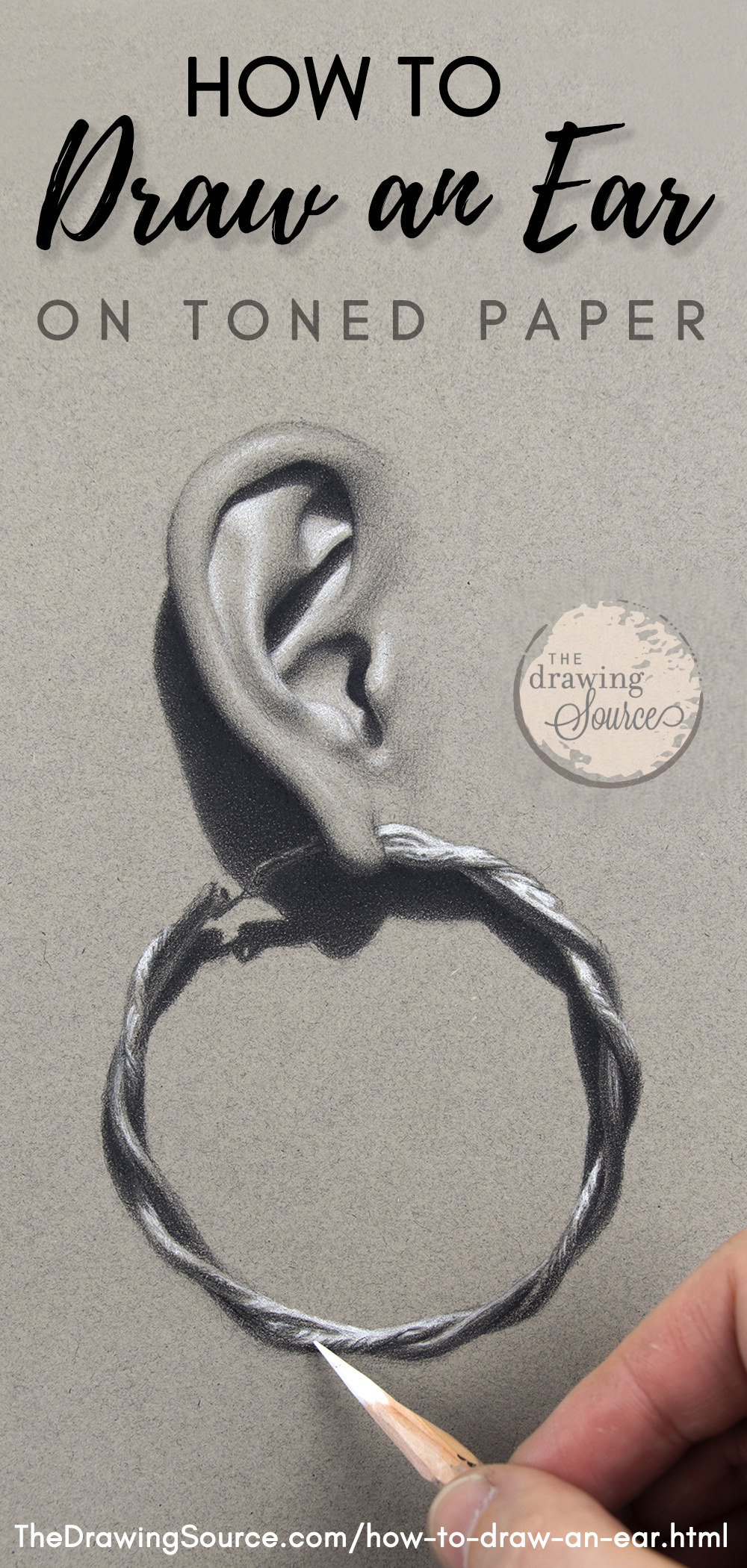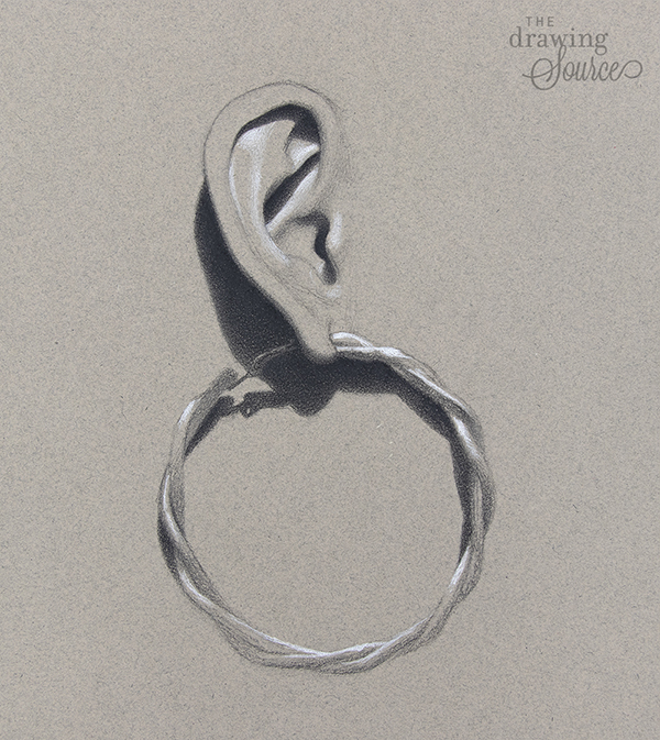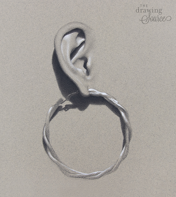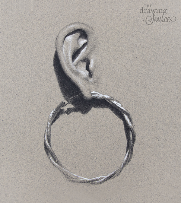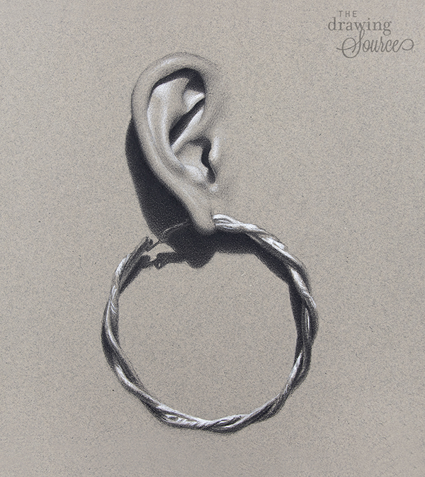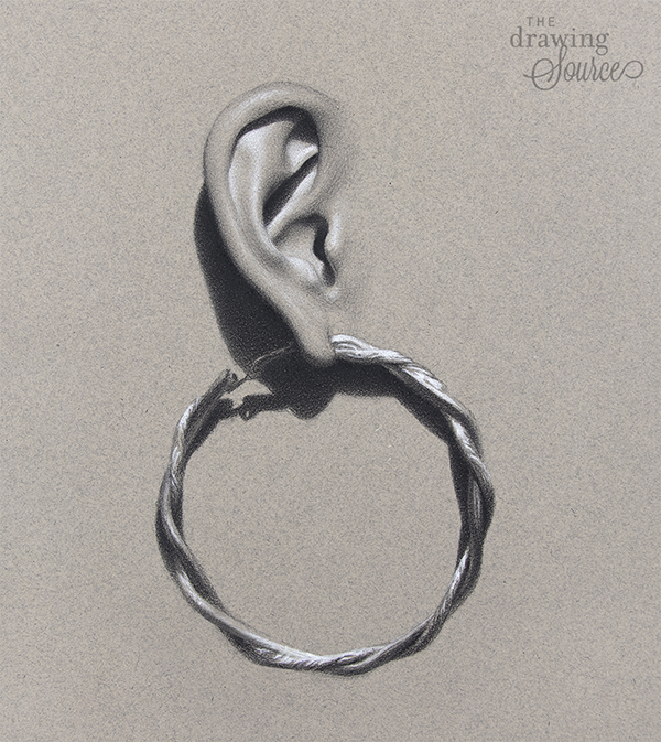 If you try out this drawing (by downloading the reference photo below), remember that there are many challenges in this scenario! Besides learning how to draw an ear, this toned paper technique and the earring texture are just a few of the elements that make this drawing more advanced than some of the other tutorials on the site. Be patient with yourself and take it one step at a time.