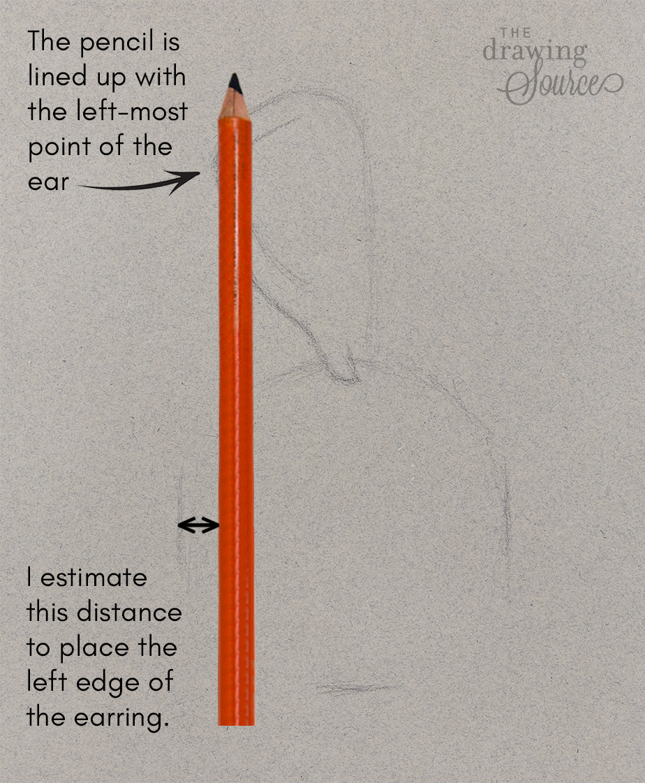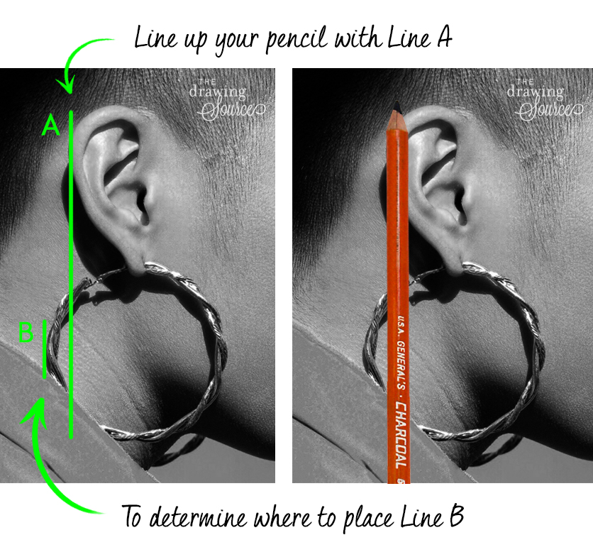 For example, I can line up my pencil with the left-most point of the ear (in the image below, Line A is extended down from that point). Then I can look to see how far to the left of Line A the earring extends. I'm looking specifically at the distance between Line A and Line B.