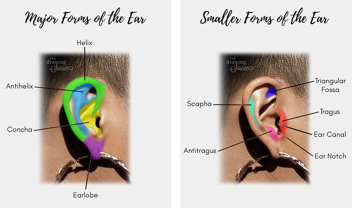 Let's look at the parts of the ear that are visible in this pose, and that I'll be referring to throughout this tutorial. The largest and most prominent parts of the ear are the helix, antihelix, concha, and earlobe (see the left image below):