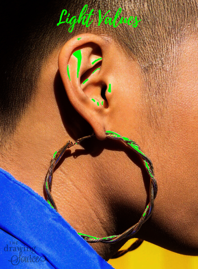 Finally, the 'third tier' of light values includes the highlights on the helix, the antitragus, and the concha: these are the 'darkest light values' (so, still within the 'light' group of values, but considerably closer to the half-tones).