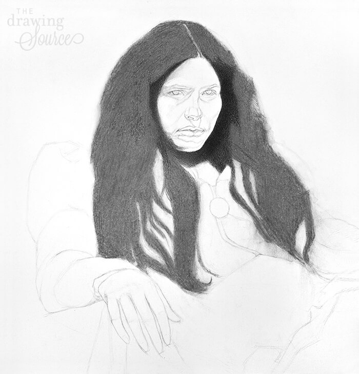 am continuing to find and draw the dark shapes in the hair. This preliminary addition of tone can be considered the 'block-in' of the value stage. Everything I