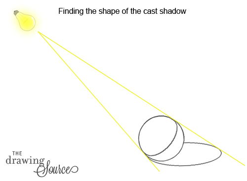 There is a useful trick to finding the shape of the cast shadow. Imagine two light rays projecting from the light source to the core shadow on the form. Continue these lines until they hit the surface on which the object rests, and they will show you the boundaries of the cast shadow.