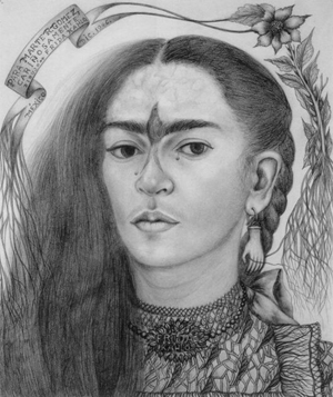 Self portrait drawing by John Marin. 1945. Frida Kahlo. 1946. Self portrait with Tears and Hummingbird.